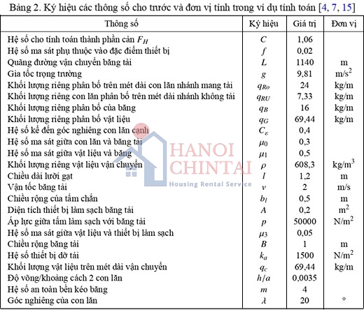 Trường hợp băng tải ngắn hơn 80 m tính theo công thức (1), trường hợp băng tải dài hơn 80 m tính theo công thức (2). Triển khai áp dụng phương pháp tính từng thành phần lực cản quy định trong [5-7] sau đó cộng lại. Trong bài viết thiết lập cho băng vải cao su có kết cấu 1 con lăn, 2 con lăn, 3 con lăn nhánh có tải khi bỏ qua thành phần cản phụ đặc biệt FS2. Ký hiệu các thông số trong công thức và đơn vị tính trình bày trong Bảng 1 và Bảng 2. Kết quả tính toán lực cản khi áp dụng [5-7] như sau: