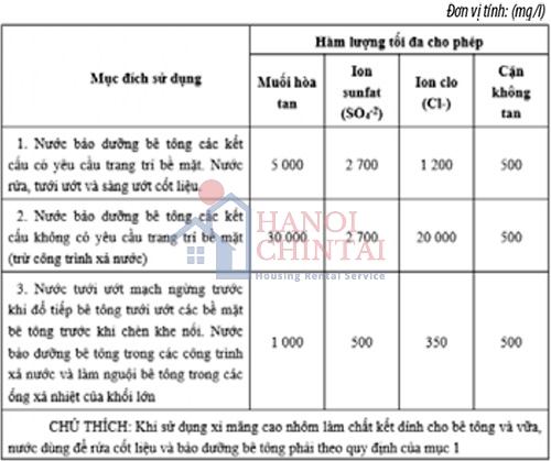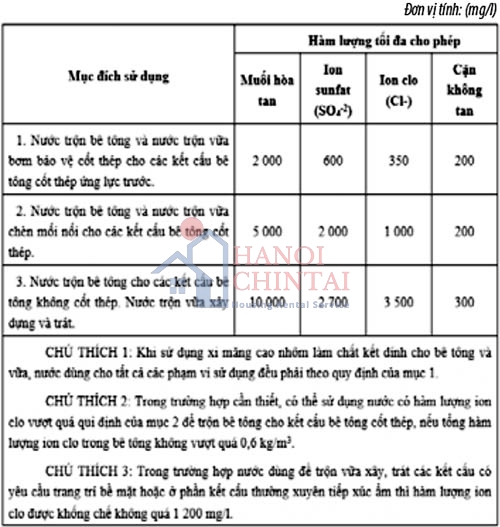 - Không có màu khi dùng cho bê tông và vữa trang trí. Theo mục đích sử dụng, hàm lượng muối hòa tan, lượng ion sunfat, lượng ion clo và cặn không tan không được lớn hơn các giá trị quy định trong Bảng 1 (đối với nước trộn bê tông và vữa) và Bảng 2 (đối với nước dùng để rửa cốt liệu và bảo dưỡng bê tông). Tổng đương lượng kiềm quy đổi tính theo Na2O không được lớn hơn 1000 mg/l khi sử dụng cùng với cốt liệu có khả năng gây phản ứng kiềm - silic.