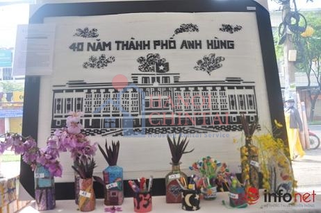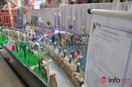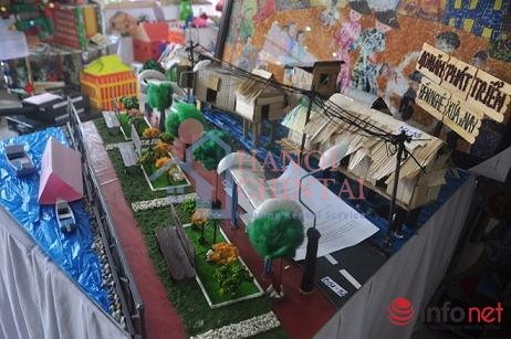 Từ hàng trăm loại phế thải bỏ đi, các em học sinh sáng tạo thành những sản phẩm mô hình. Trong ảnh là mô hình đoạt giải nhất về 40 năm phát triển Bến Nghé xưa và nay của các em học sinh THCS Tăng Bạt Hổ A (Q.4)