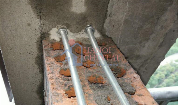Lưu ý việc tạo rãnh đổ bê tông bằng cách xây gạch đỏ hai bên, bê tông được đổ rộng khoảng 15cm. Thép được đan trong rãnh để tăng cường kết nối giữa tường cũ và tường mới.
