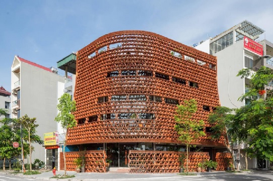Lớp vỏ gạch rỗng: Sử dụng gạch thông gió hoặc gạch xây thông thường nhưng xếp cách điệu để tạo lỗ hổng. Như công trình Wall House đã sử dụng gạch lỗi để tạo nên một hệ tường có khả năng tự đối lưu không khí. Lớp vỏ này tạo ra một vùng áp suất đệm. Gió khi đi qua các khe nhỏ sẽ bị nén lại và tăng tốc, tạo ra luồng khí mát hơn khi đi vào nhà. Đồng thời, bóng đổ từ các viên gạch tạo nên hiệu ứng thị giác thay đổi theo thời gian trong ngày.