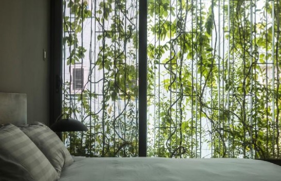 Lớp màng thực vật: Một hệ khung thép mạ kẽm kết hợp với các bồn cây đặt tại mép sàn mỗi tầng với các loại cây dây leo phủ kín tạo thành một tấm rèm xanh như công trình Breathing House tại TP.HCM. Lớp rèm thực vật hoạt động như một bộ khuếch tán môi trường. Chúng cản bức xạ mặt trời trực tiếp, lọc bụi mịn từ đường phố, và cung cấp oxy. Quan trọng hơn, chúng giải quyết bài toán riêng tư người bên trong có thể nhìn thấy màu xanh và phố phường, nhưng người bên ngoài không thể nhìn thấu vào không gian sinh hoạt.