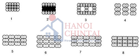 Hình - Bố trí trụ trộn ướt trên biển:1- Kiểu khối , 2 - Kiểu tường, 3- Kiểu kẻ ô, 4 - Kiểu cột, 5- Cột tiếp xúc, 6- Tường tiếp xúc, 7- Kẻ ô tiếp xúc, 8- Khối tiếp xúc.