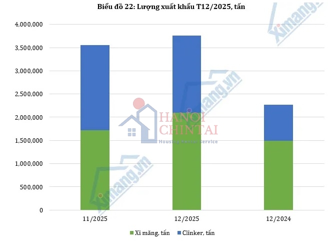 Tổng lượng xi măng và clinker xuất khẩu trong tháng 12/2025 đạt hơn 3,76 triệu tấn, tăng 6% so với tháng trước và tăng mạnh so với cùng kỳ năm 2024. Mức tăng cao so với cùng kỳ cho thấy sự phục hồi rõ rệt của thị trường xuất khẩu trong giai đoạn cuối năm.