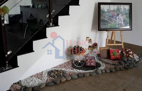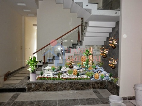 Tiểu cảnh hồ hoa súng cũng rất độc đáo. Sự kết hợp ăn ý giữa đá, hồ nước mini và những bức tường trang trí đá tạo thành bức tranh thủy mạc tuyệt đẹp cho chân cầu thang.